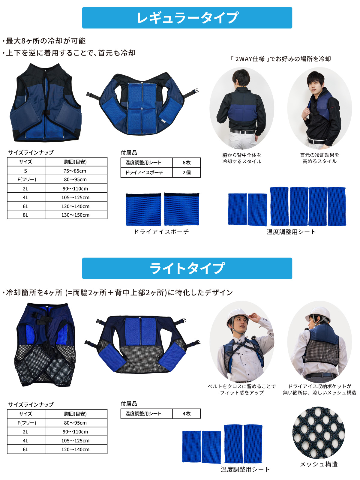 | 使用中の状況 | 保冷剤が結露し衣類がウェットに | 高温環境下では温風を吸い込む | 昇華するため衣類はドライ状態をキープ |